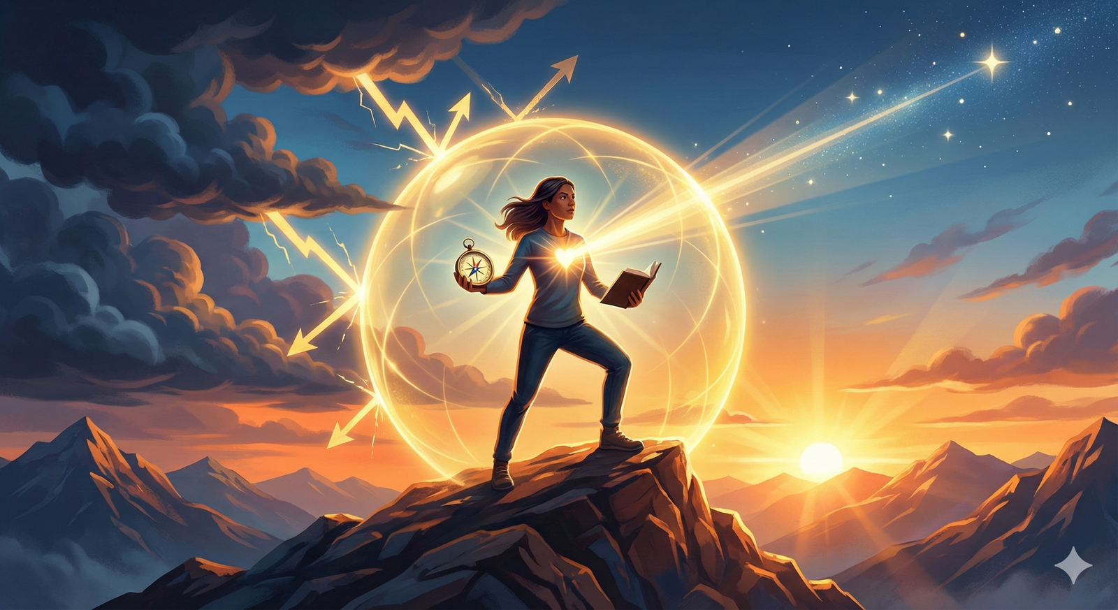 Ilustração representando a jornada do sucesso e resiliência: um mulher subindo uma montanha íngreme em direção a uma luz dourada, segurando uma bússola e um escudo, simbolizando o propósito e a proteção contra críticas.